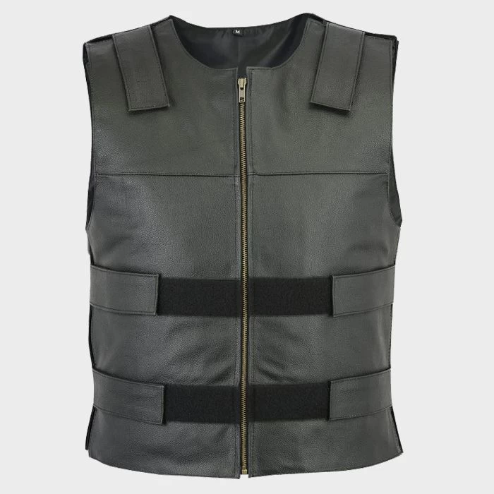 Le gilet en cuir de style pare-balles noir est fait de cuir de buffle 100% véritable de haute qualité.
